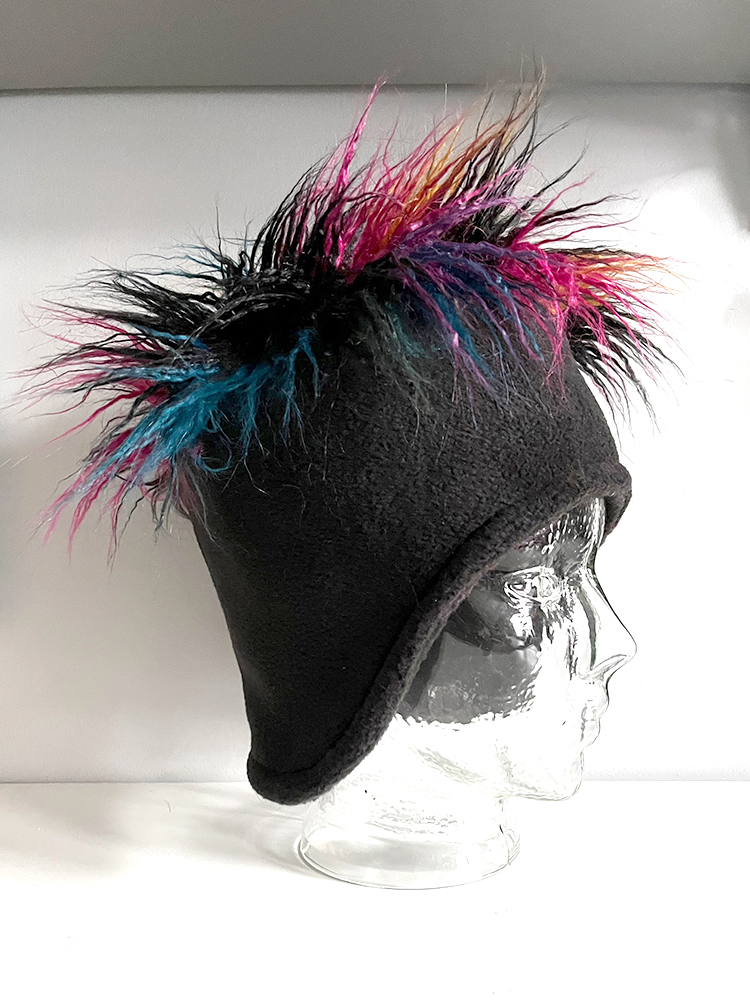 Im Stoffpaket für unsere stylische Wintermütze.sind 25cm dickes, schwarzes Fleece und ein Stück farbenfroher Zottelstoff.