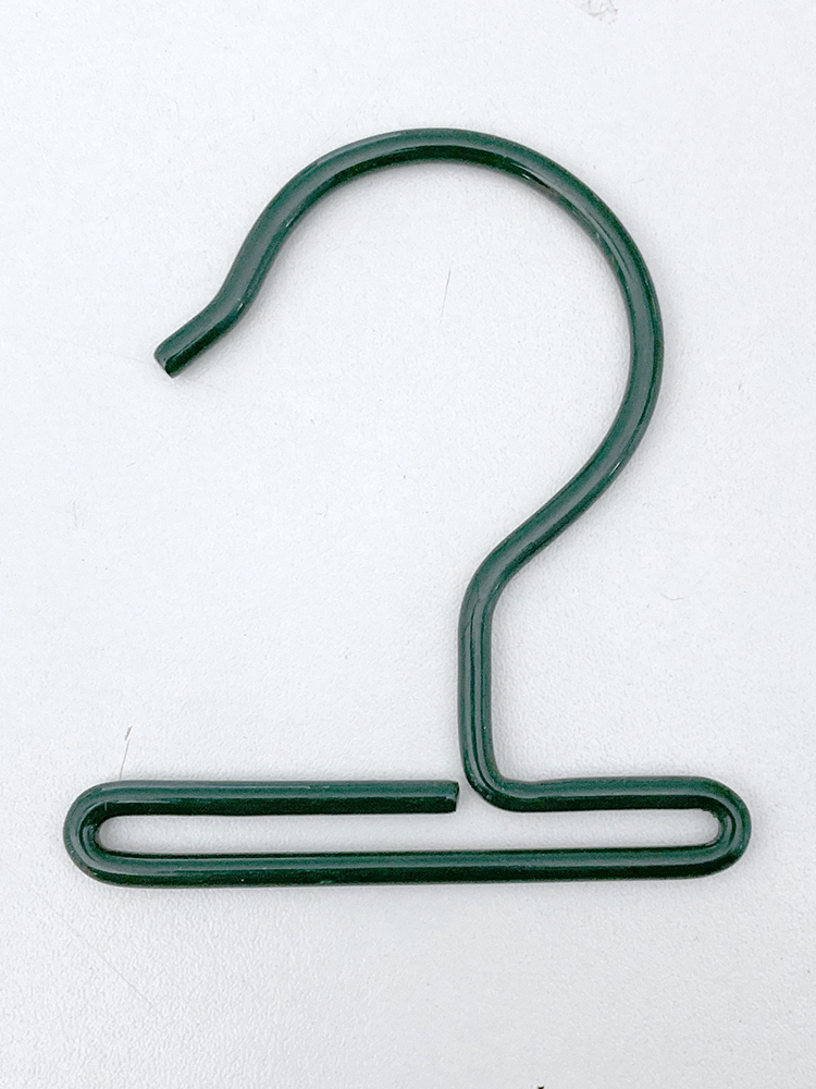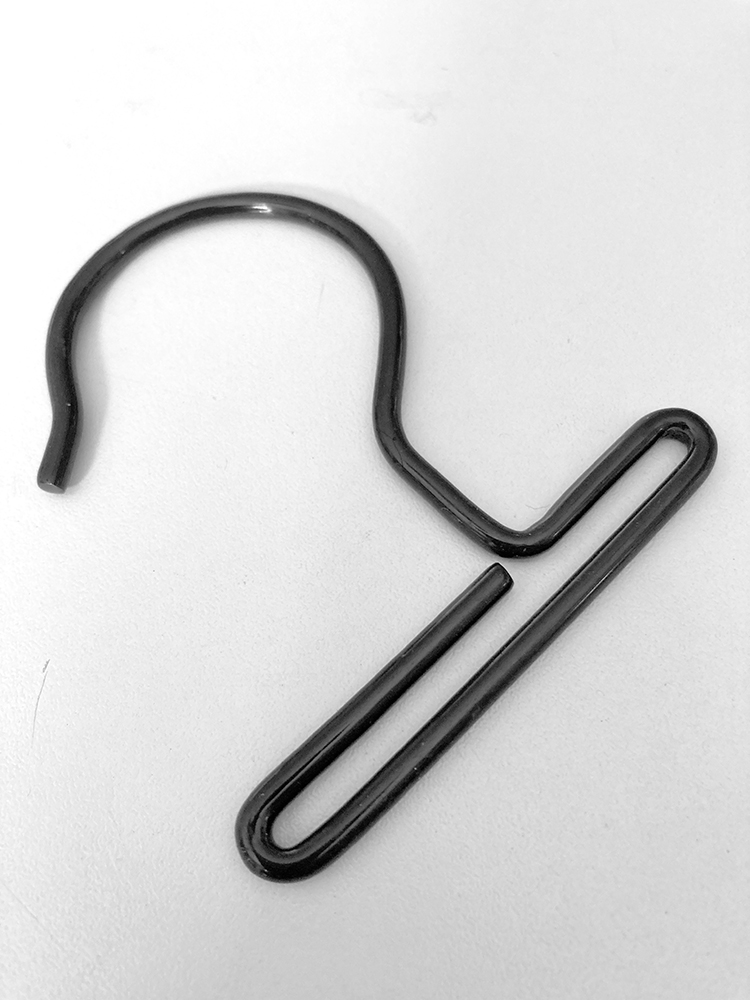 Aus glänzend beschichtetem, 3mm starkem Draht. Dieser Haken eignet sich gut als Aufhänger für Kulturbeutel oder Utensilos. Die untere Schlaufe ist innen etwa 5,5cm breit, der ganze Haken ist ca. 7,2cm hoch. Durch die kleine Öffnung lässt er sich auch nach dem Nähen noch anbringen und zum Waschen auch wieder abnehmen.
