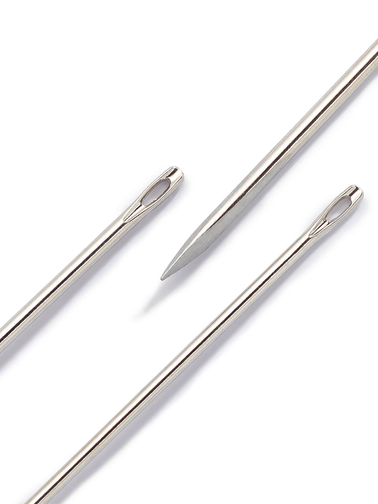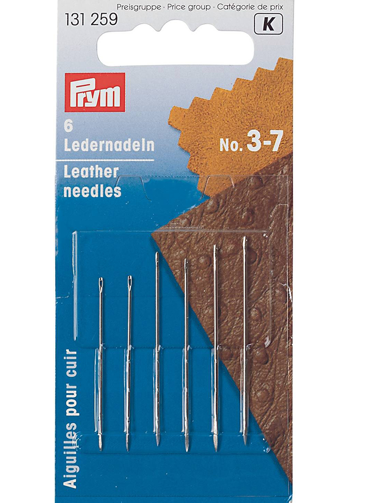 Für die Verarbeitung von Leder eignen sich am besten die Ledernadeln aus gehärtetem Stahl in den Größen 3, 5, 7 und 9. Die Nadeln mit ihrer Dreikantspitze erleichtern das Einstechen in Ledermaterial und verhindern zusätzlich, dass es ausreißt.