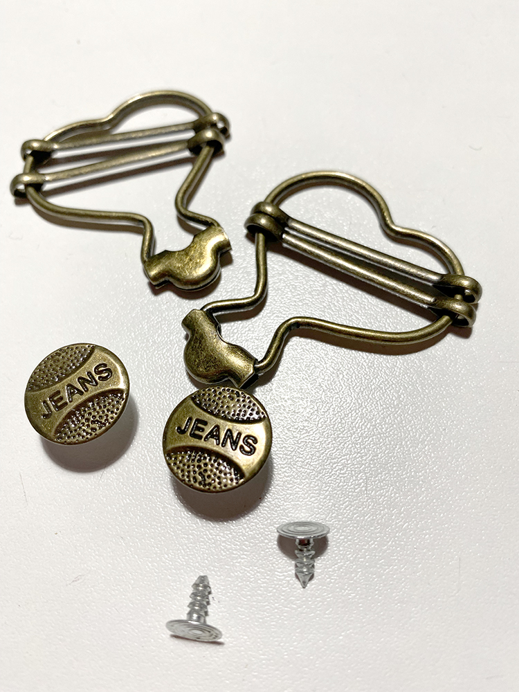 In der Packung sind zwei Haken und zwei Knöpfe . Durch die zwei beweglichen Schieber lässt sich der Gurt einfädeln und in der Länge verstellen. Die Knöpfe werden vernietet. Dazu den Knopf auf eine weiche Unterlage legen und den Stift mit einem Hammer vorsichtig von unten einschlagen. Diese Latzhosenverschlüsse sind natürlich rostfrei und können in der Maschine gewaschen werden. Sie passen an bis zu 30mm breite Bänder.