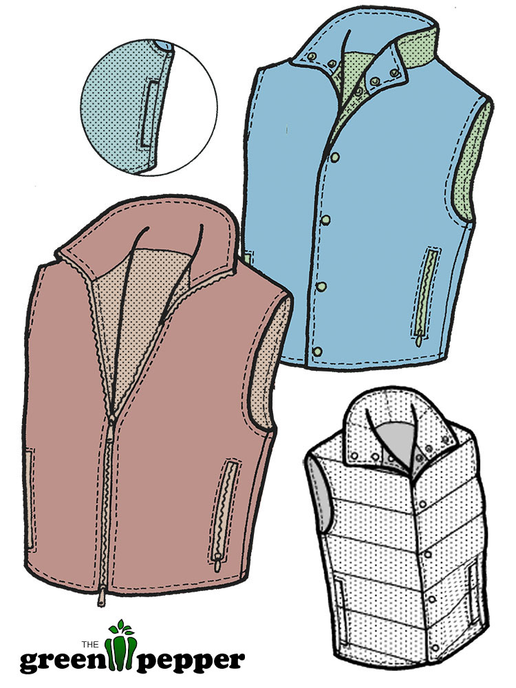 Weste zum Wenden, mit Eingrifftaschen auf beiden Seiten und Stehkragen. Vorne wahlweise mit Reißverschluss oder Druckknöpfen.
